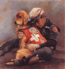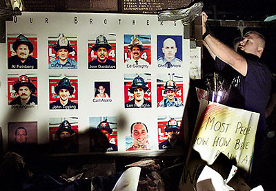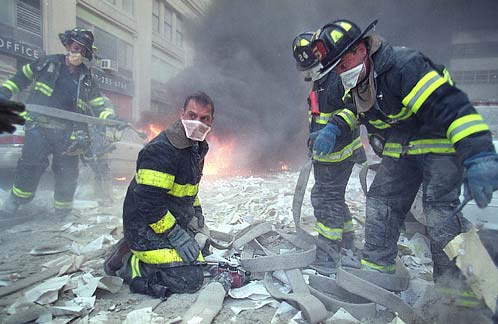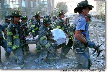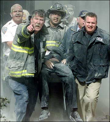 Picture of Firemen carrying their beloved Chaplain out of the ruins.